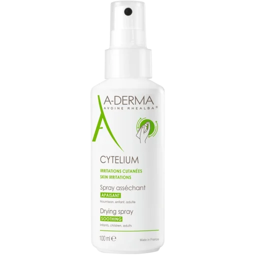 A-DERMA Cytelium Drying Spray er en beroligende og udtørrende spray velegnet til hud med let væskende irritationer hos både voksne, børn og spædbørn. Den er ideel at bruge til at dæmpe irritation, kløe eller udslæt, der kan opstå overalt på kroppen, i ans, A-DERMA Cytelium Drying Spray 100 ml.