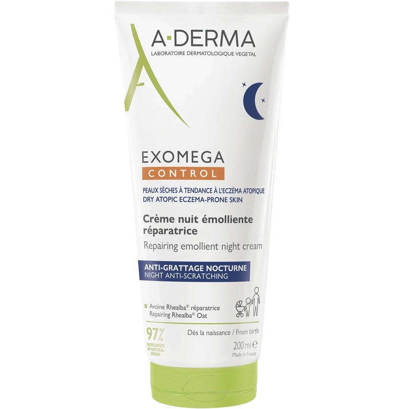 A-DERMA Exomega Control Emollient Night Cream er en beroligende og blødgørende natcreme, som er udviklet til at give dig en rolig nat uden kløe. Den kan anvendes i ansigtet og på kroppen hos både voksne, børn og spædbørn, som har tør hud med tendens til a, A-DERMA Exomega Control Emollient Night Cream 200 ml.