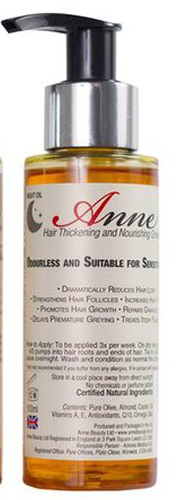 Anne odourless and suitable for sensitive scalps 100ml Denne over natten olie er en fantastisk alt naturlig hårolie til at nære, reparere, styrke, reducere hårtab, tykkere, forlænge, ??genoprette glans, mindske splittede ender, forsinke for tidlig grav