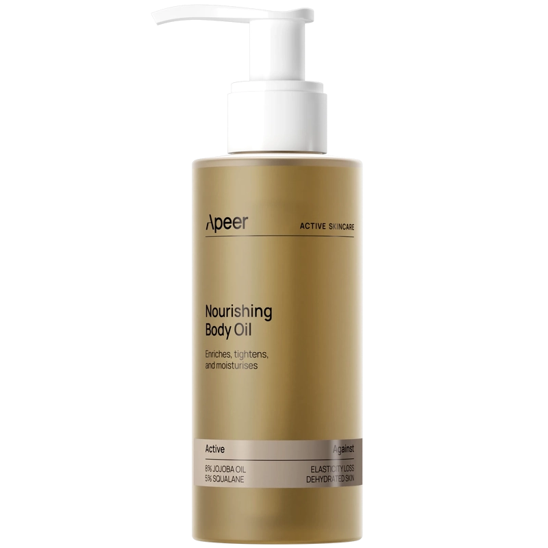 Apeer Nourishing Body Oil er en let og lækker olie til kroppen. Den er beriget med jojobaolie, som med sit rige indhold af vitaminer og antioxidanter kombineret med antiinflammatoriske egenskaber, leverer blødgørende og beroligende pleje til huden. Vitami, Apeer Nourishing Body Oil 150 ml.