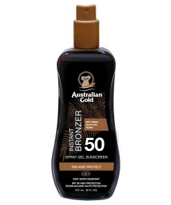 Australian Gold Instant Bronzer Spraygel SPF 50 er en solbeskyttelse med Instant Bronzer som er en innovativ type solcreme, der kombinerer den praktiske spray-pumpe funktion med effektiviteten af en traditionel bodylotion. Ideel til dem, der elsker en let, Australian Gold Instant Bronzer Spraygel SPF 50 – 237 ml.
