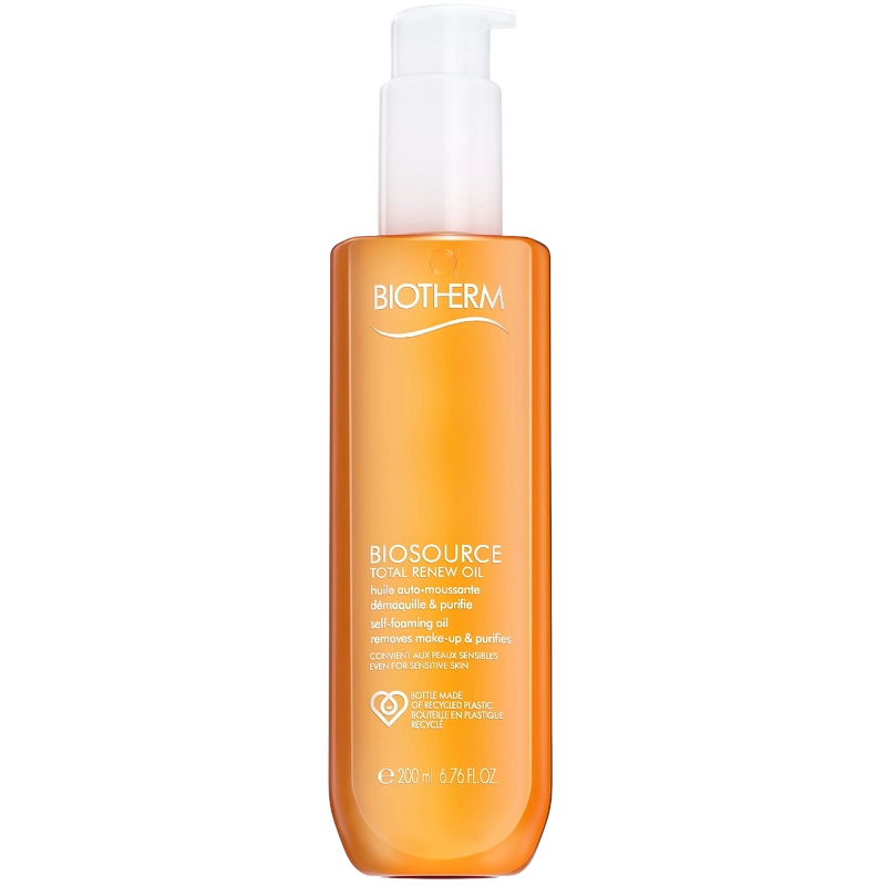 Biotherm Biosource Total Renew Oil er et lækkert renseprodukt, som både fjerner snavs og makeup fra huden. Den fjerner alle spor af makeup, snavs, sved og selv vandfast øjenmakeup. Den har en lækker olieret konsistens, som forvandler sig til en rensende s, Biotherm Biosource Total Renew Oil 200 ml.