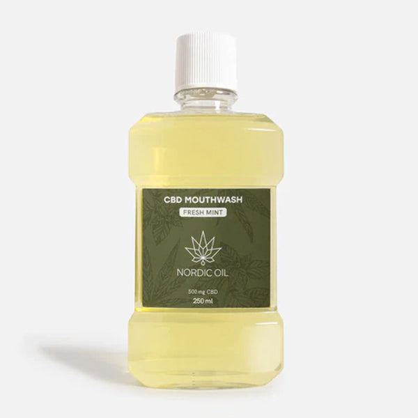 Forfriskende og kraftfuld mundskyl til bedre mundhygiejne. Rengør og plej din mund, dine tænder og dit tandkød med Nordic Oils antibakterielle mundskyllevæske. Renser tænder og tandkød og bekæmper dårlig ånde – et must på ethvert badeværelse.. CBD mundsky, CBD Mundskyl.