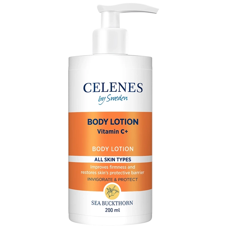 Celenes Sea Buckthorn Body Lotion med C-vitamin blødgør, beroliger og fugter huden med naturlige urteekstrakter. Hjælper naturligt med at øge kollagen produktionen og elastin i huden med Omega 7-rig kilde, havtorn. Beskytter huden mod aggressive ydre fakt, Celenes Sea Buckthorn Body Lotion 200 ml.