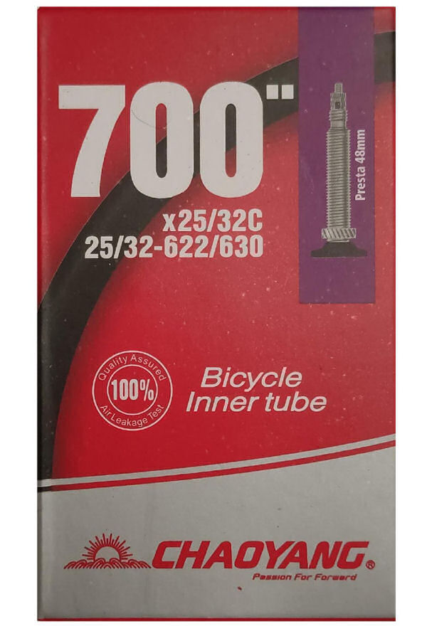 Chaoyang bicycle inner tube 700″ FV48 fremragende trækstraktevne ydeevne. 0,90 MM TYKKELSE. 0,90 mm i tyndhed. Lette og holdbare racerrør. 700×25/32C. 25/32-622/630. F/V 48 mm.