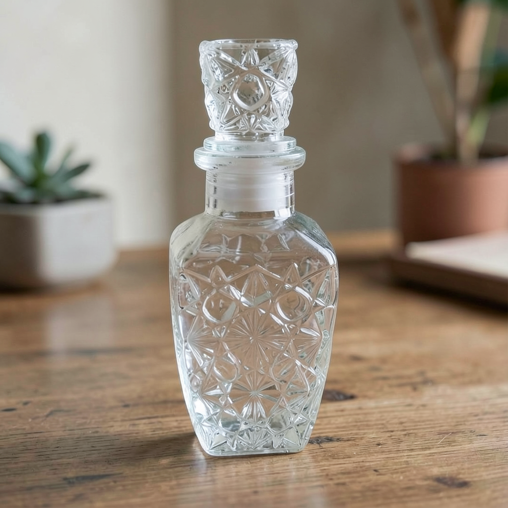 Elegant og yndefuld glasflaske med glasprop – perfekt som dekorativ detalje i badeværelse eller på toilethylden.