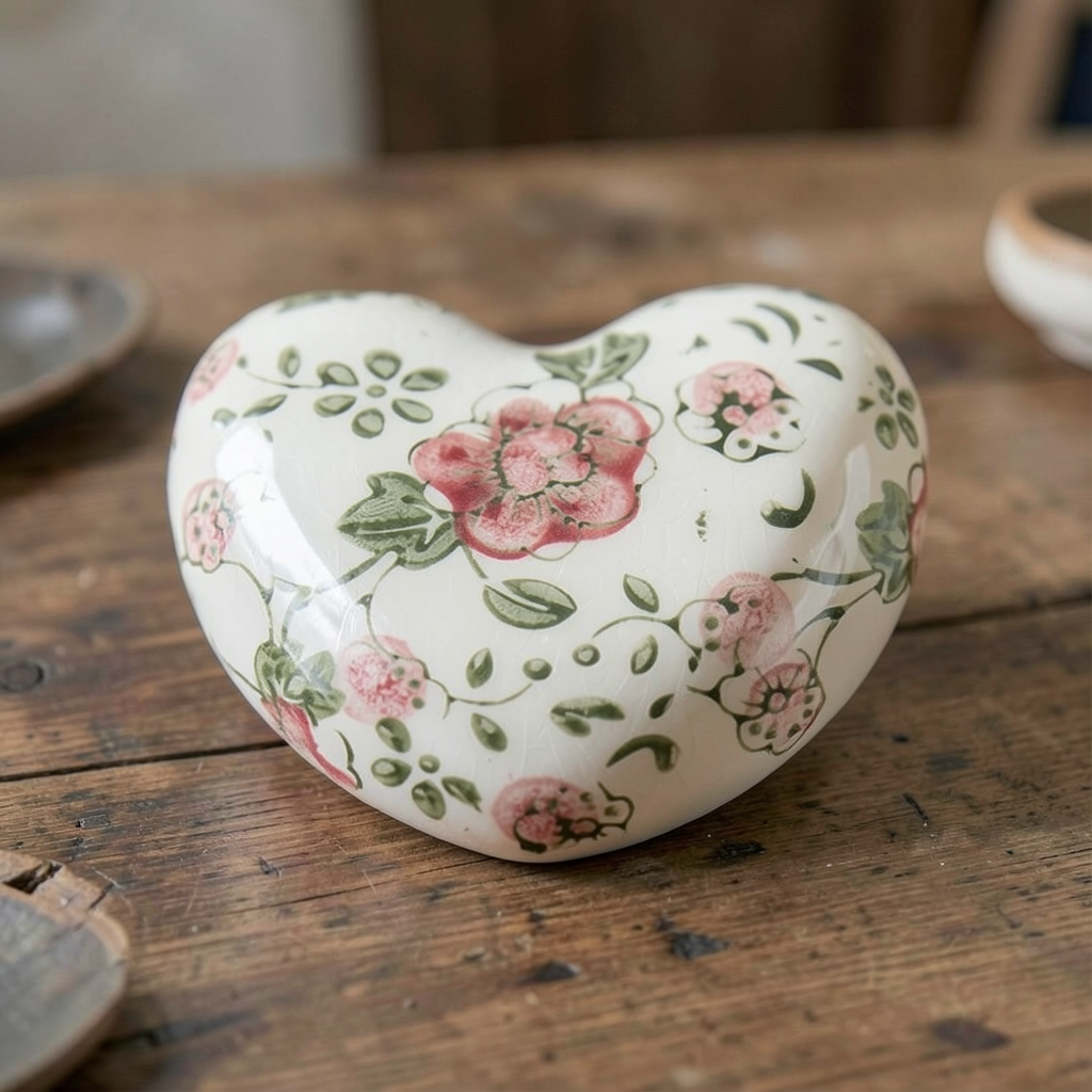 Dekorativ Keramikfigur – Hjerte med Blomster, 8 × 4 cm (Brocante Stil)