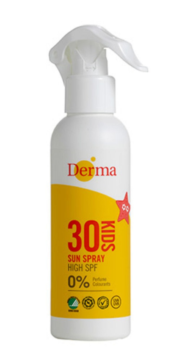 Derma kids sun spray SPF30 high 0% perfume 200ml Derma Kids Solspray SPF 30 er en allergivenlig og sikker solcreme med høj, vandfast solbeskyttelse.Den er udviklet specielt til børn og voksne med sart hud – uden parfume – og trænger hurtigt ind i huden
