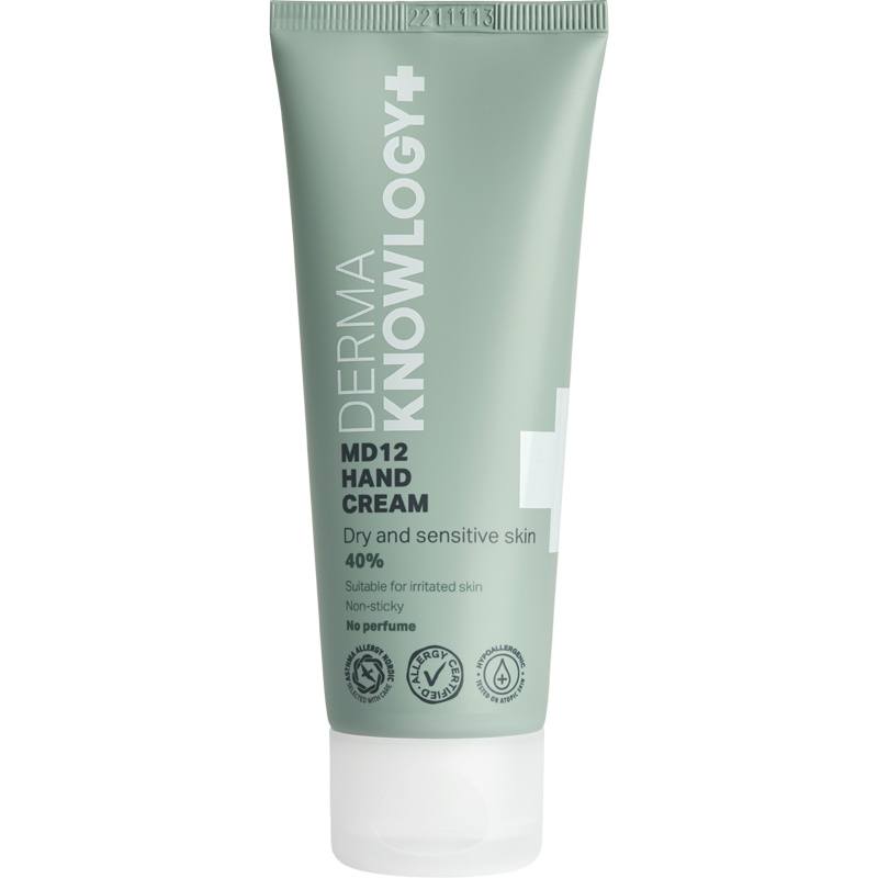 DermaKnowlogy MD12 Hand Cream er en effektiv håndcreme, som er udviklet til tør, sart hud med tendens til atopisk eksem. Den har 40% fedtindhold og indeholder rige ingredienser, som nærer huden og styrker dens naturlige barriere, og er velegnet som daglig, DermaKnowlogy MD12 Hand Cream 75 ml.