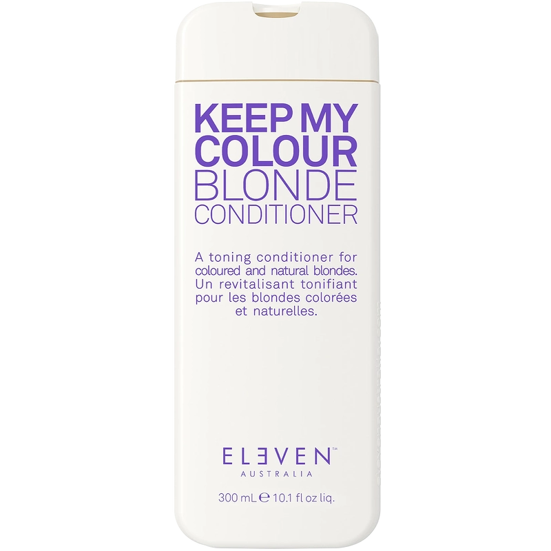 ELEVEN Australia Keep My Colour Blonde Conditioner er en conditioner, som er specielt udviklet til at modvirke gyldne toner i alle typer blond hår – både naturligt og farvet. Den blå formel stammer fra det såkaldte ext. violet 2, som forstærker de blonde, ELEVEN Australia Keep My Colour Blonde Conditioner 300 ml.