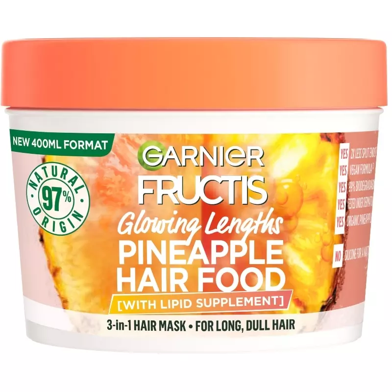 Garnier Fructis Hair Food Pineapple Mask er en fantastisk og super velduftende 3-i-1 hårmaske til dig med et langt hår med spaltede spidser, der mangler glans og næring Den består af 97% naturlige ingredienser såsom planteolie, og egner sig godt til curly, Garnier Fructis Hair Food Pineapple Mask 400 ml.
