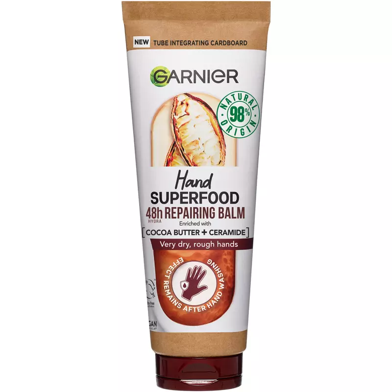 Garnier Hand Superfood Cocoa 48H Nourishing Balm er en reparerende håndcreme til meget tørre og ru hænder. Denne håndcreme er udviklet med en vegansk formel med 98% naturlig oprindelse, som virker fugtgivende i op til 48 timer, og effekten varer ved på tr, Garnier Hand Superfood Cocoa 75 ml.