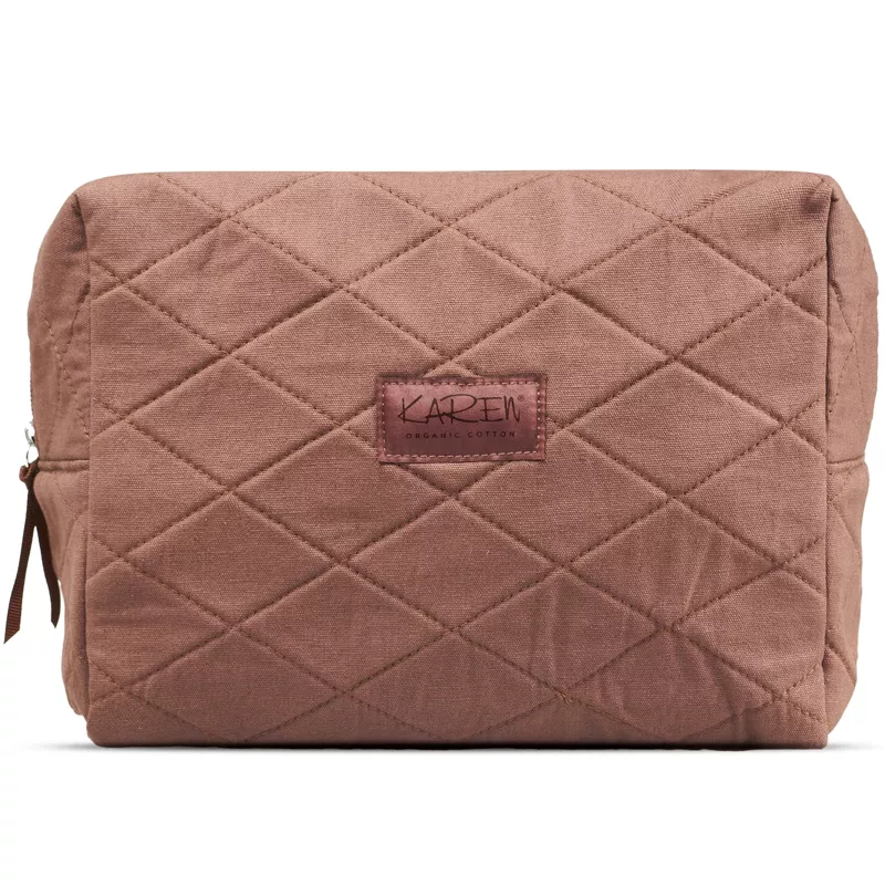 Gillian Jones Karen Cosmetic Bag – Mocca 10073-521 er en fin toilettaske i quiltet, økologisk bomuld og med stort lynlåsvedhæng, der gør den nem at åbne . Denne toilettaske har fire indvendige lommer, der er ekstra forstærket med et panel, og er stor nok, Gillian Jones Karen Cosmetic Bag – Mocca 10073-521.