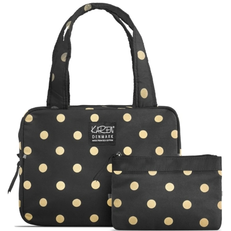 Gillian Jones Karen Set – Black 10070-112 er et fint sæt bestående af en stor og rummelig toilettaske, samt en mindre makeuppung i sort med råhvide prikker. Den store taske er med lynlås, to håndtag, et stort rum, samt 4 lommer, så man kan organisere alle, Gillian Jones Karen Set – Black 10070-112.