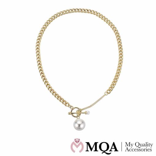 Giv dig selv, eller en du holder af en elegant og stilfuld choker halskæde fra vores populære smykkekollektion My Quality Accessories. Kæden er har et stort vedhæng i form af en flot, blank perle. Selve toggle låsen er nær, Halskæde guldfarvet, stor flot perle, guldfarvet toggle lås.