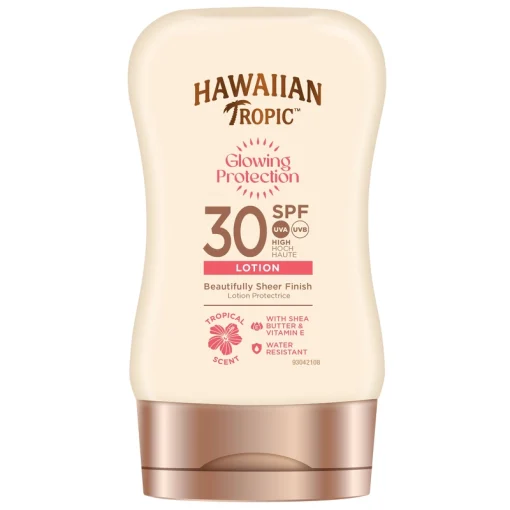 Hawaiian Tropic Glowing Protection Lotion SPF 30 giver din hud den pleje, den fortjener. Denne lette lotion er beriget med en nærende formel, der er vandafvisende og som sikrer at du kan have langvarig nydelse af solen, uanset om du er ved poolen eller på, Hawaiian Tropic Glowing Protection Lotion SPF 30 – 100 ml.