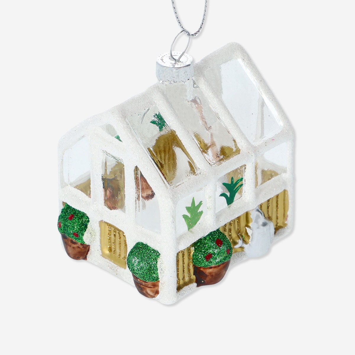 Tilføj et finurligt strejf til din indretning med denne drivhusjulekugle! Denne glaskugle måler 6,8 x 7,4 x 6 cm og har et charmerende drivhusdesign. Hæng den op, og lad din indretning emme af julens magi., Julekugle. Drivhus.