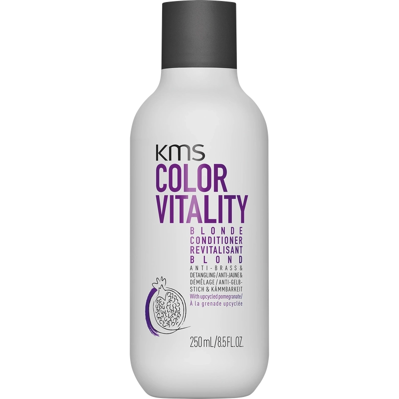 KMS ColorVitality Blonde Conditioner er en lækker conditioner, som forbedrer de kolde toner i blond, lysnet eller gråt hår. Formlen med violette pigmenter og upcyclet granatæble fremhæver de kolde toner i blondt, lysnet eller gråt hår og holder de blonde, KMS ColorVitality Blonde Conditioner 250 ml.