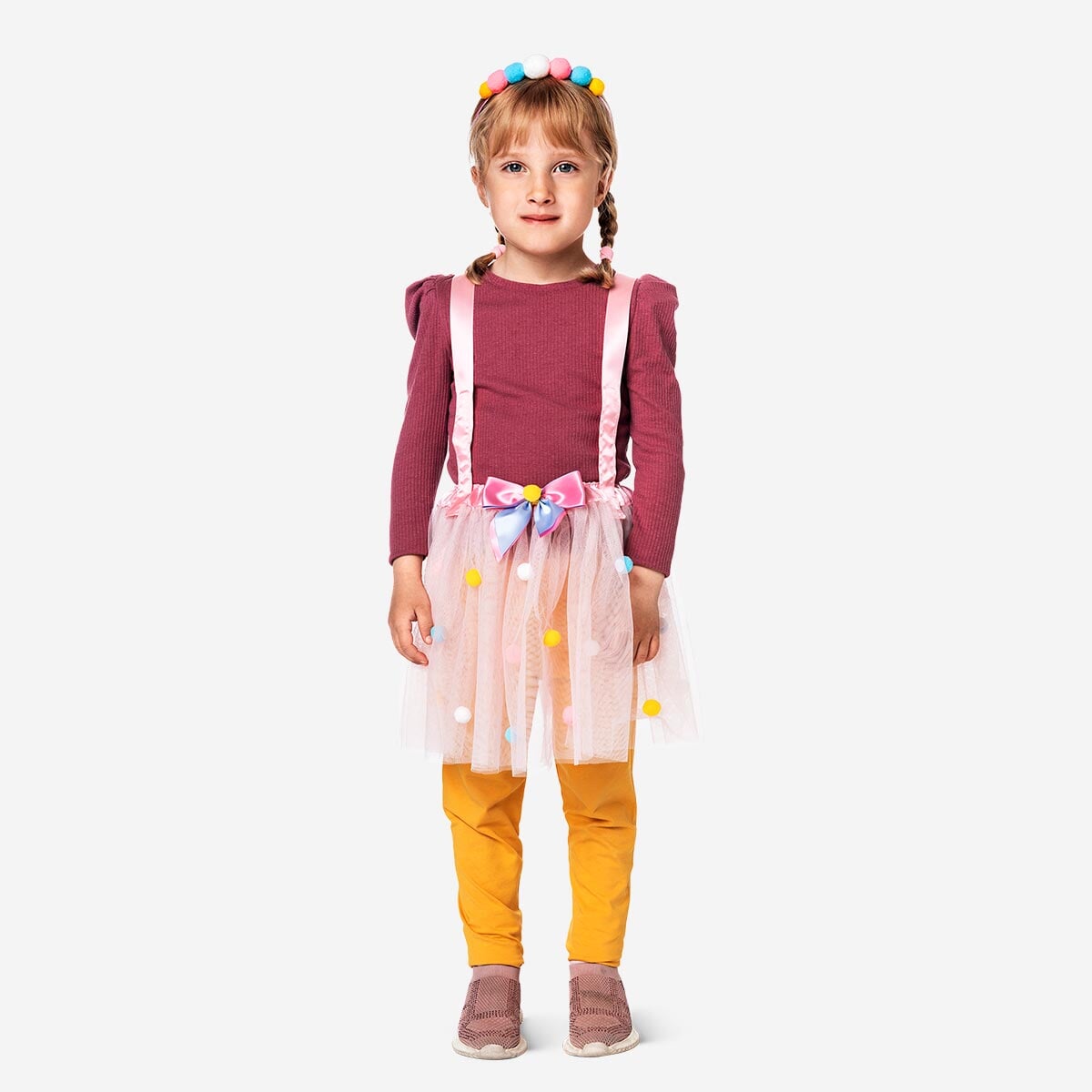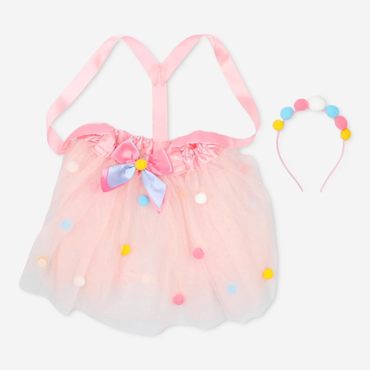 Hyg dig og klæd dig ud i det smukke og farverige kostume. Kostumet indeholder et hårbånd og et tylskørt. Kostumet er lavet af polyester og plastik og passer til størrelserne 3-6 år. Hårbåndet måler 16 x 13 cm og kjolen måler 59 x 21 cm., Kostume. 3-6 år.