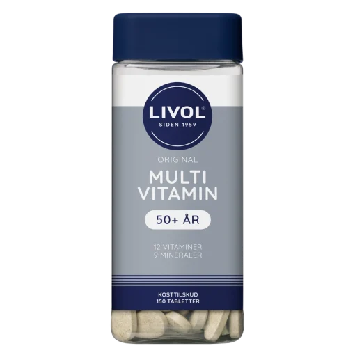 Livol Multivitamin 50+ er et kosttilskud specielt til voksne over 50 år, som indeholder 12 vitaminer og 9 mineraler. Livol Multivitamin 50+ indeholder bl.a. thiamin, som hjælper til en normal hjertefunktion. Riboflavin, vitamin B6, B12 og C, folsyre, niac, Livol Multivitamin 50+ 150 Pieces.