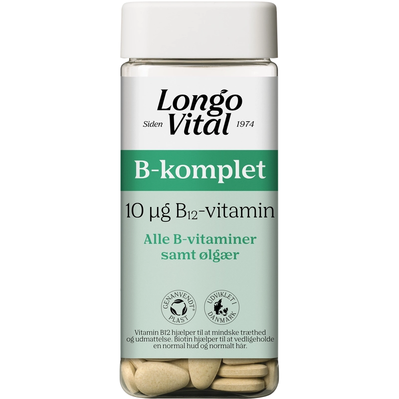 LongoVital B-komplet er et kosttilskud med alle B-vitaminer og ølgær. Dette kosttilskud indeholder en komplet sammensætning af alle 8 forskellige B-vitaminer, herunder 10 ug B12-vitamin. Thiamin bidrager til et normalt energistofskifte, mens Riboflavin bi, LongoVital B-komplet 180 Pieces.