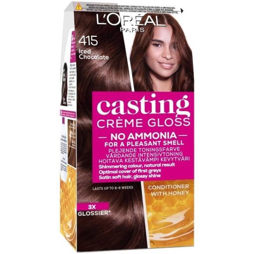 L'Oréal Paris Casting Créme Gloss 415 Iced Chocolate er en plejende brun og rød toningsfarve uden ammoniak. Det er en ultra glansgivende hjemmefarve, som dækker grå hår op til 70% og giver silkeblødt hår. Den er velegnet til naturligt, stribet og farv, L'Oreal Paris Casting Creme Gloss 415 Iced Chocolate.