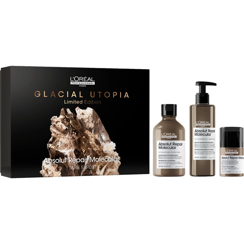 L'Oréal Professionnel Absolut Repair Molecular Gift Set (Limited Edition) er en professionel hårplejeserie til skadet hår. TRIO-sættet indeholder tre produkter L'Oréal Professionnel Absolut Repair Molecular Shampoo, Rinse-Out Serum og Leave-In er, L'Oreal Professionnel Absolut Repair Molecular Gift Set (Limited Edition).