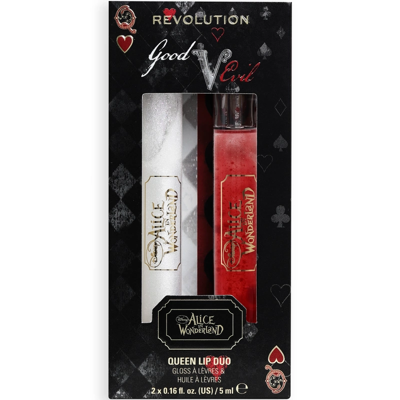 Makeup Revolution Disney's Alice in Wonderland og Revolution The Queens Lip Duo er et sæt med to lipglosses, inspireret af de to ikoniske dronninger fra filmen Alice i Eventyrland – Den Hvide Dronning og Den Røde Dronning. Den ene gloss er lys og pe, Makeup Revolution Disney's Alice in Wonderland & Revolution The Queens Lip Duo 5 ml.