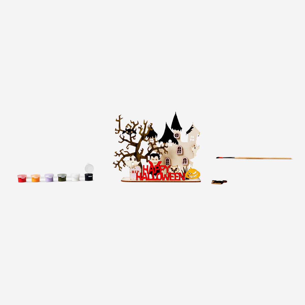 Dyk ned i en verden af DIY kreativitetens verden med vores Mal-dit-eget-spøgelseshus-sæt. Dette træhus måler 18 x 10 cm, når det er samlet, og er et perfekt lærred til din kunstneriske flair. Pakken indeholder maling og en pensel, så du kan personliggøre dit hjemsøgte hus efter din smag. Gør dig klar til en uhyggelig og sjov hobbyoplevelse, når du vækker dette hjemsøgte hus til live med dit kreative touch. Vis dit færdige mesterværk frem som en Halloween dekoration eller giv det som gave til en, der elsker den uhyggelige charme ved et håndmalet spøgelseshus., Mal selv-spøgelseshus.