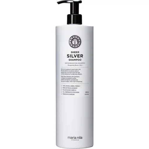 Maria Nila Sheer Silver Shampoo er specielt udviklet til blondt, hvidt eller gråt hår. Den indeholder blandt andet brombærekstrakt og violette pigmenter, som er med til at modvirke gullige nuancer i håret. Den giver et smukt glansfuldt hår, og er samtidig, Maria Nila Sheer Silver Shampoo 1000 ml.