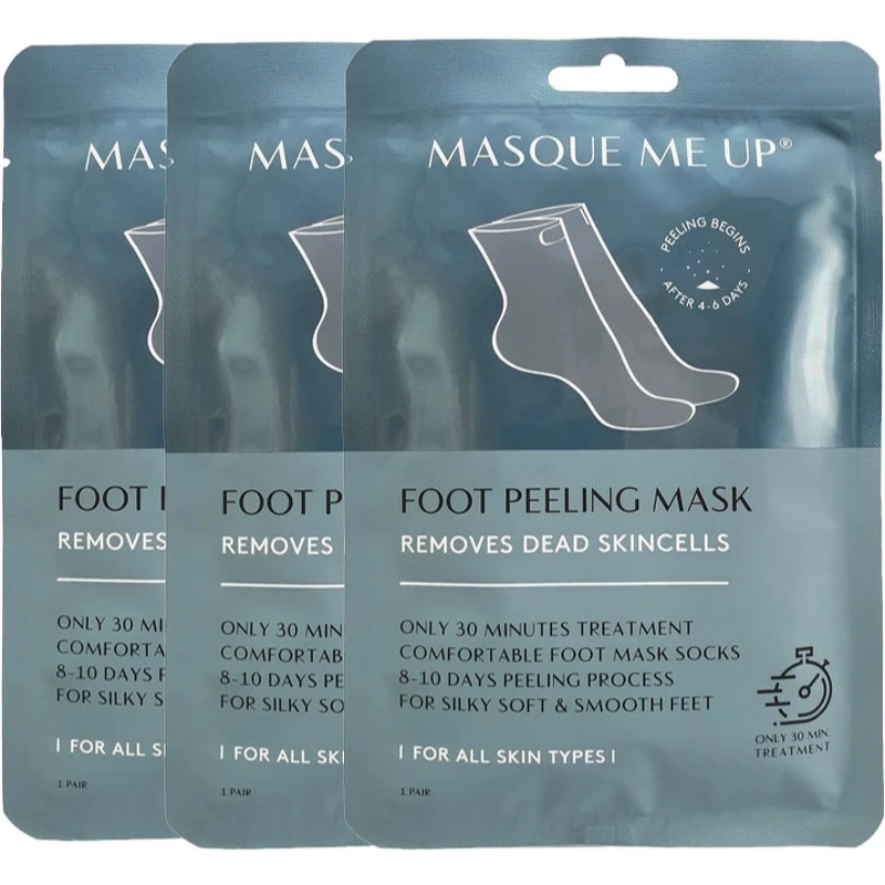 Masque Me Up Foot Peeling Mask 3 Piece Set er et sæt med hele 3 stk. af den populære fodmaske, som er din redning i kampen mod tørre fødder og problemer med hård hud, og samtidig spare penge. Disse "sokker" indeholder en blanding af mælkesyre, g, Masque Me Up Foot Peeling Mask 3 Piece Set.