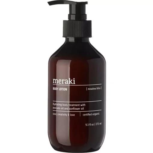 Meraki Body Lotion Meadow Bliss er en super lækker bodylotion, som gemmefugter og blødgør din hud. Indholdet af økologisk aloe vera hjælper med at modvirke tør hud, mens økologisk avocadoolie har en blødgørende og fugtende effekt. Da olien er rig på antio, Meraki Body Lotion Meadow Bliss 275 ml.