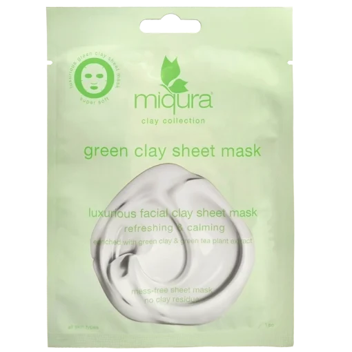 Miqura Green Clay Sheet Mask er en luksuriøs og praktisk lermaske til ansigtet som har en beroligende og forfriskende effekt. Leret i masken sidder fast i sheet’et og skal således ikke vaskes af. Masken indeholder ud over leret andre effektive ingredien, Miqura Green Clay Sheet Mask 1 Pieces.