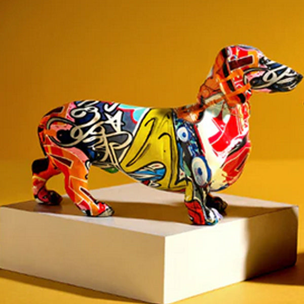 Model Gravhund. Kan bruges til dekoration i dit eget hjem eller som en gave.. 2 modeller. Model A stor ( ca. 28 x 9,5 x 17 cm ) pris kr. 399,00. Bodel B lille ( ca. 22 x 8 x 14 cm ) pris kr. 299,00. Der kan være lidt farve nuancer i forhold til billederne, Model Gravhund – Kreative farverige figurer.