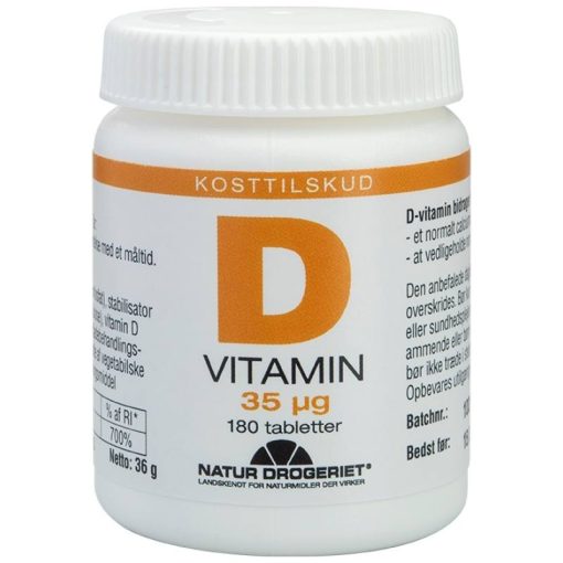 Natur Drogeriet D-Vitamin 35 ug er et kosttilskud til voksne og børn fra 11 år. D-vitamin medvirker til dit immunforsvarets normale funktion og er med til at vedligeholde dine knogler. Det er et vitamin, der er svært at få tilstrækkeligt af gennem kosten,, Natur Drogeriet D-Vitamin 35 ug 180 Pieces.