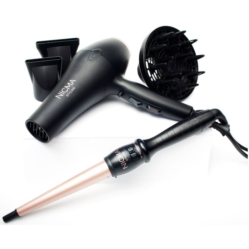 NICMA Styling Hair Dryer + Curling Wand er et lækkert sæt med en kraftfuld føntørrer og et fantastisk krøllejern i et klassisk sort design med fine rose gold detaljer, som du kan skabe smukke resultater med. Er din gamle hårtørrer ved at stå af? Eller vil, NICMA Styling Hair Dryer + Curling Wand (Limited Edition).