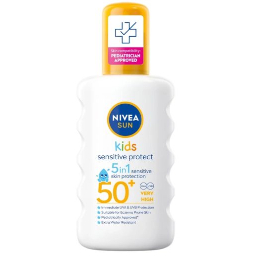 Nivea Sun Kids Sensitive Protect 5-In-1 Spray SPF 50+ er en smart og effektiv solcreme til børn, som giver meget høj beskyttelse mod solens UVA- og UVB-stråler. Denne solcreme giver huden 5-i-1 beskyttelse mod solskoldning og langvarige hudskader, ligesom, Nivea Sun Kids Sensitive Protect 5-In-1 Spray SPF 50+ – 200 ml.