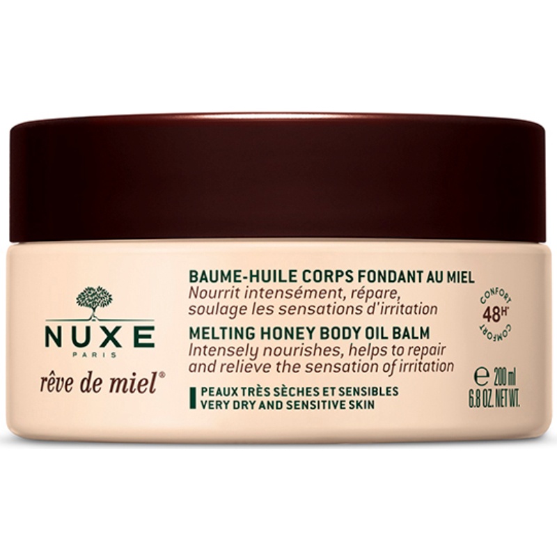 Nuxe Rêve De Miel Body Oil Balm er en smeltende honning-kropsolie-balsam, der intensivt nærer og hjælper med at reparere og lindre følelsen af irritation, på meget tør hud. Dens høje koncentration af fedtsyrer (argan og borage precious botanical oils), g, Nuxe Reve De Miel Body Oil Balm 200 ml.