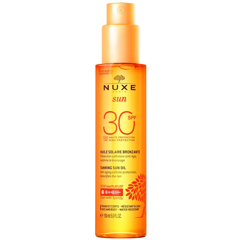 Nuxe Sun Tanning Oil High Protection SPF 30 er en lækker sololie med en høj solbeskyttelse. Olien kan både bruges til ansigt og krop, og er vandafvisende. På grund af oliebasen har den en nærende virkning på huden, og beskytter cellerne mod at ældes. På g, Nuxe Sun Tanning Oil High Protection SPF 30 – 150 ml.