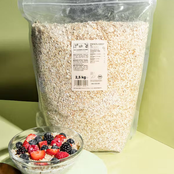Finvalsede havregryn i 100 % økologisk kvalitet. Fremstillet i Tyskland. Perfekt til müsli, grød, overnight oat & havregrynsdeller. Højt indhold af fibre (10 g/100 g). Fordelagtig emballage: mindre plastik og færre omkostninger. Køb nu: Økologiske havregr, Økologiske havregryn finvalsede 2,5 kg.