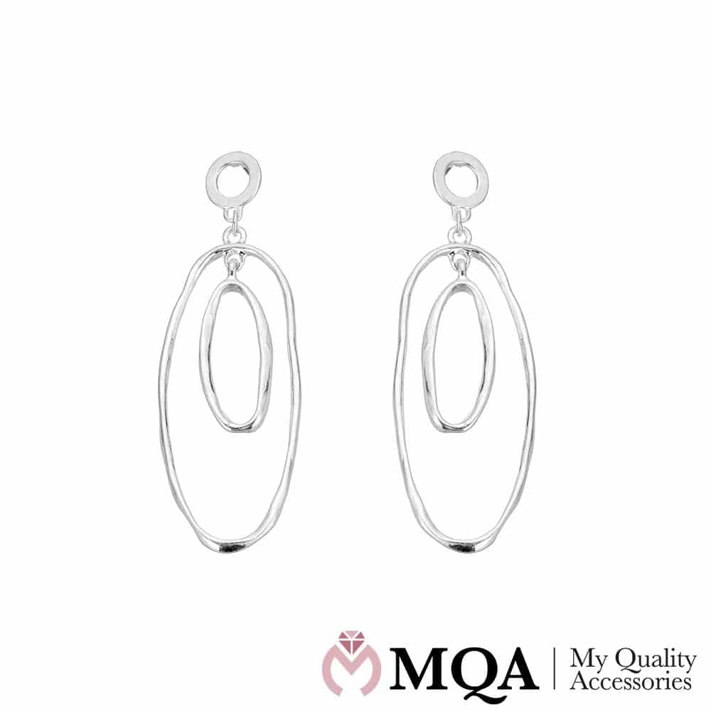 Industrielle og moderigtige øreringe i sølv lakeret metal, formet som lille cirkel med et organisk formet vedhæng. Et flot sæt øreringe der både går rigtigt godt til en travl hverdag på job eller i skole og pe, Øreringe cirkel, vedhæng med organisk form.