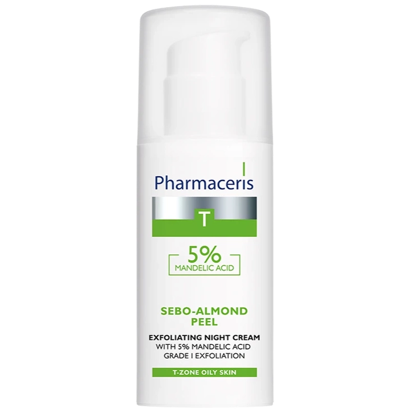 Pharmaceris T Sebo-Almond Peel 5% Exfoliating Night Cream er en eksfolierende natcreme til pleje af uren hud med tendens til akne, herunder sart og følsom hud, hud med pigmentpletter og ujævn hudtone, samt fedtet hud. Cremen kan bruges året rundt. Om somm, Pharmaceris T Sebo-Almond Peel 5% Exfoliating Night Cream 50 ml.