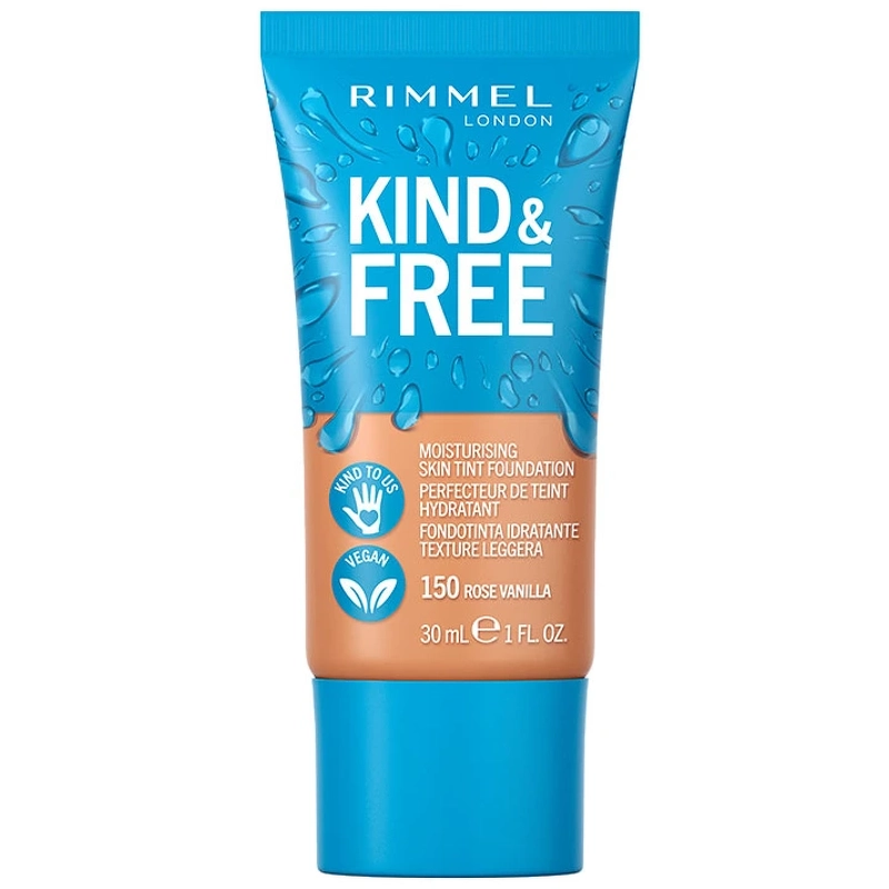 RIMMEL Kind og Free skin Tint – 150 Rose Vanilla er Rimmels første rene foundation som er 100% vegansk og cruelty-free. Denne serie er fri for parfume, mineralske olier og animalske ingredienser. RIMMEL Kind og Free Skin Tint er Fremstillet med 77 % ingre, RIMMEL Kind & Free skin Tint 30 ml – 150 Rose Vanilla.
