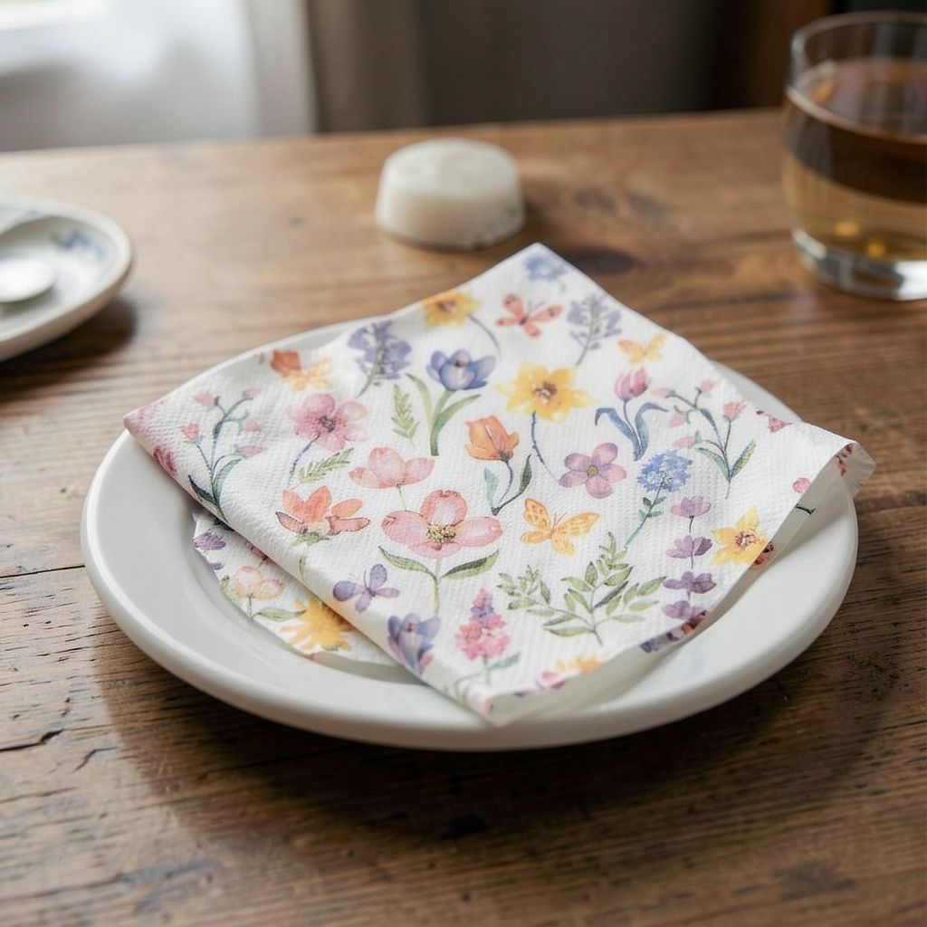 Smukke papirservietter med rosa blomster på hvid baggrund – perfekte til borddækning eller som dekorativ indpakning af små gaver.