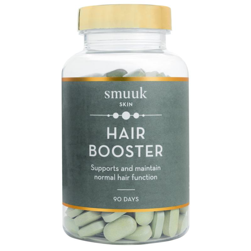 Smuuk Skin HairBooster er et kosttilskud der indeholder vitamin b1, b2, b3, b5, og b6, samt kobber, selen, l-cystein. taurin, padderokkeekstrakt og hirseekstrakt. Derudover indeholder tabletterne Zink og Biotin der bidrager til at vedligeholde et normalt, Smuuk Skin HairBooster 180 Pieces.