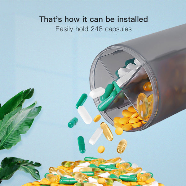 Rummelig beholder som kan deles op i 4 rum. Mål. 80mm x 86mm + 33,4mm, Stor beholder til flere piller.