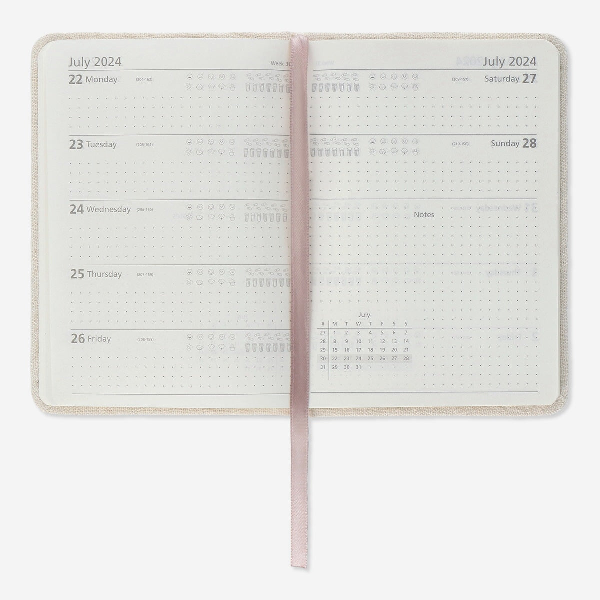 Hold dig organiseret med vores beige A6-ugedagbog. Denne dagbog måler 10,5 x 14,8 x 1 cm og indeholder 64 ark med indhold. Det nudefarvede høromslag tilføjer et strejf af elegance til din ugentlige planlægning. Forbliv produktiv og stilfuld med dette praktiske kontortilbehør., Ugekalender. A6.