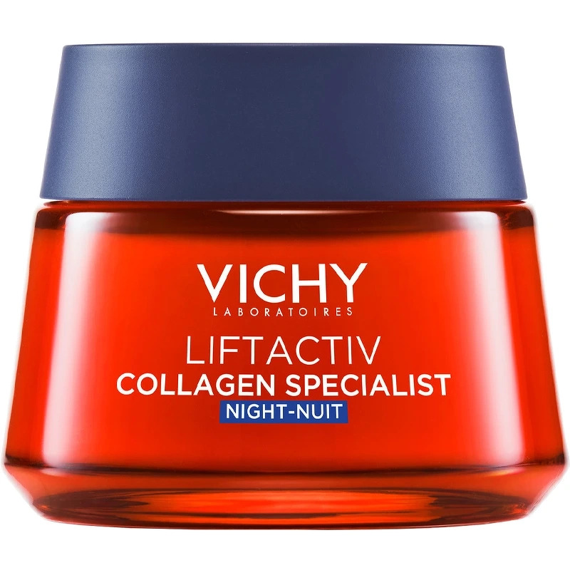 Vichy Liftactiv Collagen Specialist Night Cream er en effektiv anti-age natcreme velegnet til alle hudtyper, inklusiv sensitiv hud. Den er beriget med bl.a. resvaratrol, peptider og vitamin C, som effektivt bekæmper ældningstegn, såsom rynker, manglede gl, Vichy Liftactiv Collagen Specialist Night Cream 50 ml.